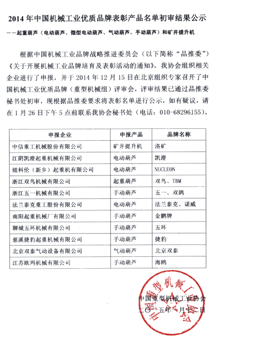 2014 China Machinery Industry recognition of product quality brand list preliminary results of the public